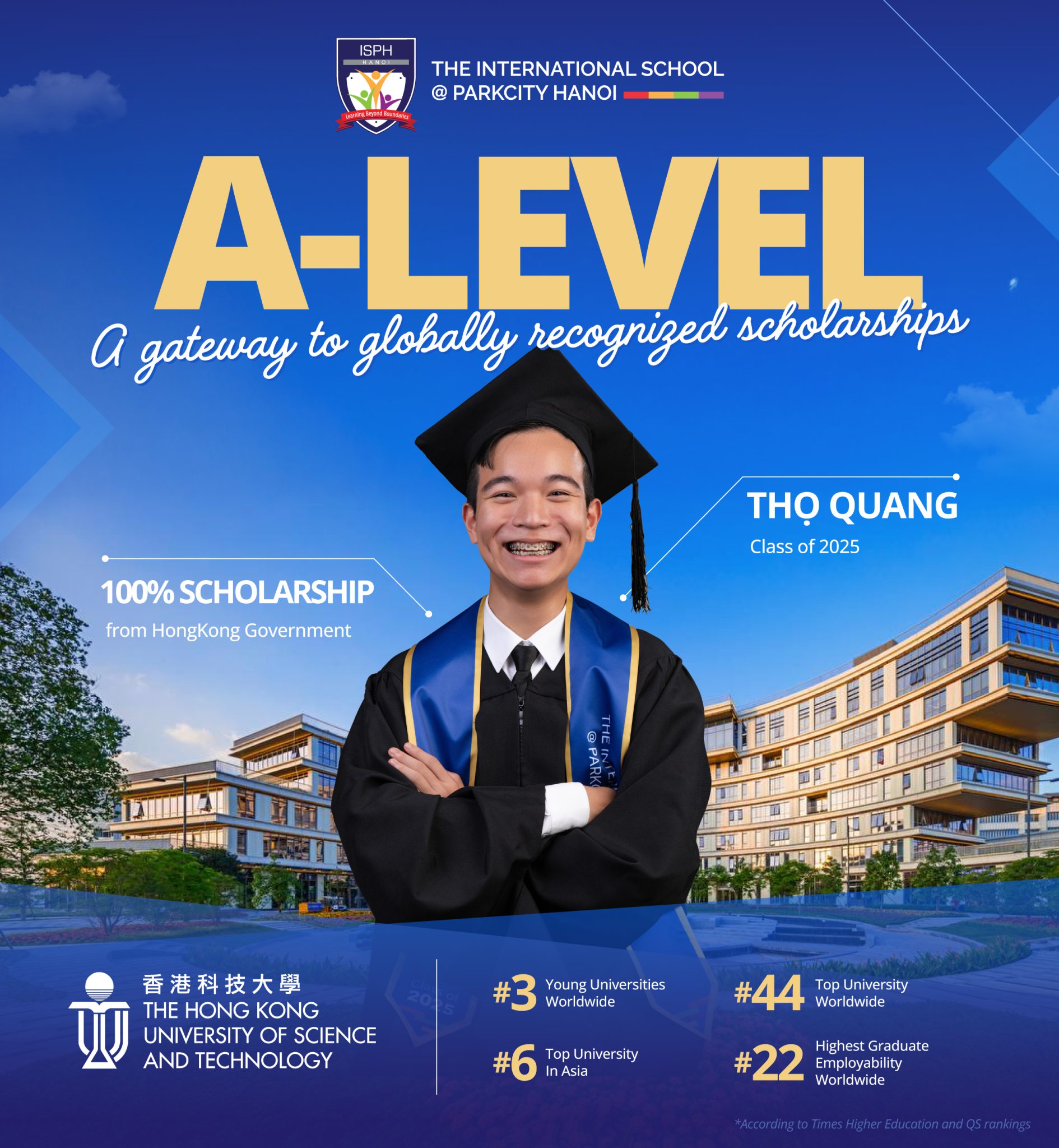The story of Tho Quang – ISPH alumnus who graduated in 2025 – is the clearest testament to this. Completing the 2024-2025 academic year with outstanding A-Level results (3A* and 1A in Mathematics, Computer Science, Economics, and Physics), Quang is honored to be one of the few Vietnamese students to receive a 100% full scholarship from the Hong Kong Government to study Computer Science at The Hong Kong University of Science and Technology (HKUST) – one of Asia’s leading universities, ranked #3 in Hong Kong, #44 globally, and among the top 10 universities in Asia according to QS World University Ranking 2025.